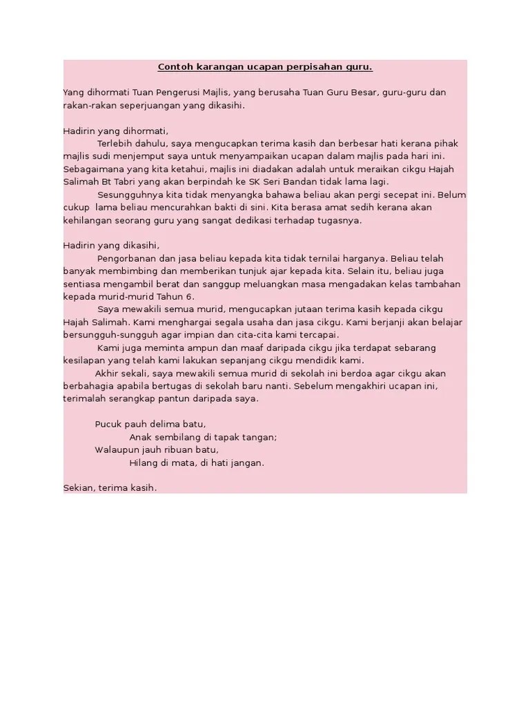 Atau mungkin memberi selamat dalam bahasa inggris? 01.10.2012 · teks ucapan majlis perpisahan 1. Teks ucapan datuk haji hajiji haji noor, menteri kerajaan tempatan dan perumahan sempena meraikan majlis perpisahan puan p.s. Ucapan perpisahan kerja untuk atasan atau mentor … Anda juga bisa sedikit memodifikasinya agar lebih kreatif dan berbeda.
